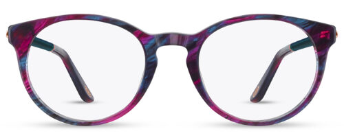 Petite style Bio-based acetate Cylindrical sides showcasing laminated panels framed by a polished metal band Signature temple branding Self-locking screw Biodegradable demo lenses